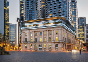 Entsprechend der Vorgaben der Denkmalpflege wird neben den denkmalgeschützten Fassaden das historische Treppenhaus an der Großen Gallusstraße/ Ecke Triangelplatz erhalten. Der geschichtsträchtige Frankfurter Saal im 1.OG wird mit seinen Innenausbauten demontiert, saniert und künftig an der ursprünglichen Stelle wieder eingebaut.