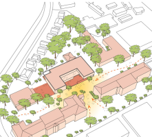 Der neue Baukörper schließt westlich an die Bestandbibliothek an, ohne funktional über einen Durchgang mit ihr verbunden zu werden. Der Neubau stärkt das Bild der Schulstraße durch Anlehnung an den Bestand in Material, Anmut und Form.