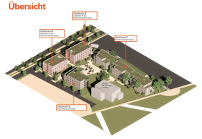 Bei der Baumaßnahme handelt es sich um den Neubau von 4 viergeschossigen Gebäuden für studentisches Wohnen einschließlich vier Gewerbeeinheiten in den Erdgeschossen der Gebäude A und B entlang der Georg-Hermann-Allee. Gebäude D ist nördlich an der Planstraße D gelegen, Gebäude C im südlichen Teil. Die 3. Obergeschosse von Gebäude C und D sind als Staffelgeschoss ausgebildet, Gebäude A und B haben vier Vollgeschosse. Die Dächer sind als Flachdach mit Extensivbegrünung ausgebildet. Die Gebäude werden als Holzbau errichtet. Kellergeschosse, sowie in den EGs Flurwände und Flurdecken, sowie die Wände und Decken der Gewerberäume in Gebäude A und B und des Gemeinschaftsraums in Gebäude C werden in Stahlbeton ausgeführt. Treppenhäuser werden in Stahlbeton ausgeführt. Die Eingänge zu den Wohngebäuden liegen hofseitig. Die Gebäude sind freistehend. Gebäude A und B sind vollunterkellert, Gebäude C und D sind teilunterkellert.